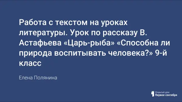 Цель урока: с помощью художественного произведения воспитывать негативную позицию к хищническому, потребительскому отношению к природе и умение связывать экологические проблемы с нравственными. Показываются нравственные идеалы В.П. Астафьева; раскрываются взаимоотношения человека и природы в рассказе «Царь-рыба».