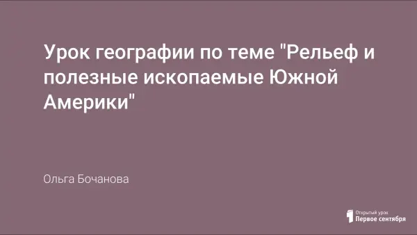 Цель урока: сформировать у учащихся общее представление о рельефе Южной Америки, познакомить с расположением и основными чертами крупных форм рельефа материка; установить взаимосвязь между рельефом, тектоническим строением и размещением полезных ископаемых.