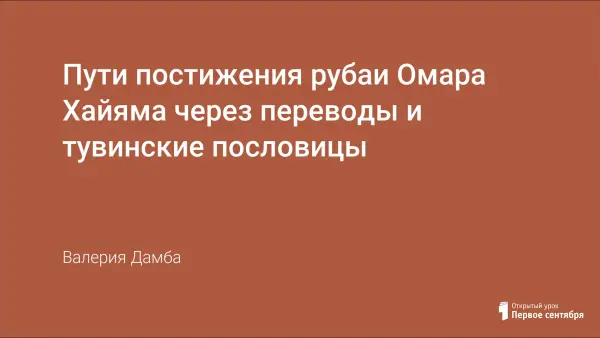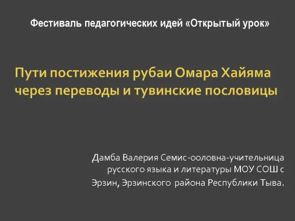 В статье рассматриваются методы обучения анализу рубаи как малого поэтического жанра, изучение их особенностей в диалоге культур (тувинской и персидской). Изучается история возникновения рубаи. Учащиеся учатся выстраивать образно-мотивные цепочки внутри единого пространства мировой литературы.