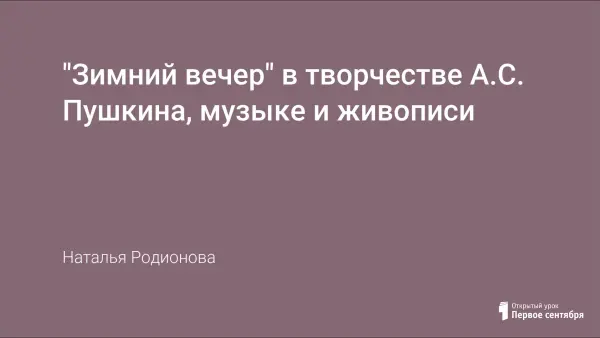 Урок позволяет по-новому взглянуть на творчество поэта Михайловской ссылки, вспомнить мелодии композиторов, которые озвучили волшебные стихи первого российского поэта. Через поэзию и музыку показана нежная привязанность поэта к своей «мамушке», няне – Арине Родионовне. Во время подробного ознакомления со стихотворением «Зимний вечер» дети приходят к выводу, что стихи необычайно музыкальны, благодаря им появилась русская народная песня и романс «Зимний вечер».
