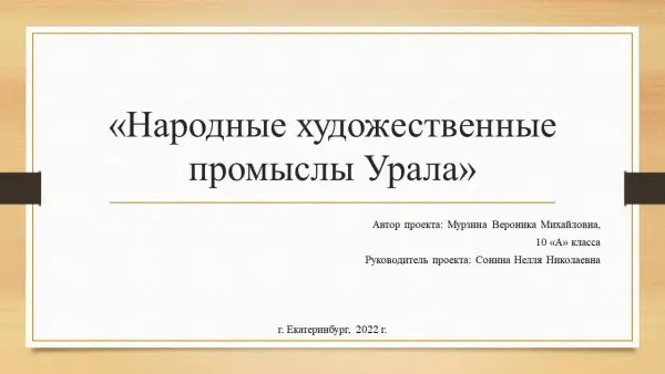 Традиционные художественные промыслы и ремесла русского населения Урала уникальны, имеют свои условия возникновения, эволюцию, многообразие видов, техник. Здесь получили свое развитие резьба, золочение и роспись по дереву, иконописание, вышивка, ткачество, ковроделие, литье, ковка, ажурная просечка металла, керамическое производство и многое др.