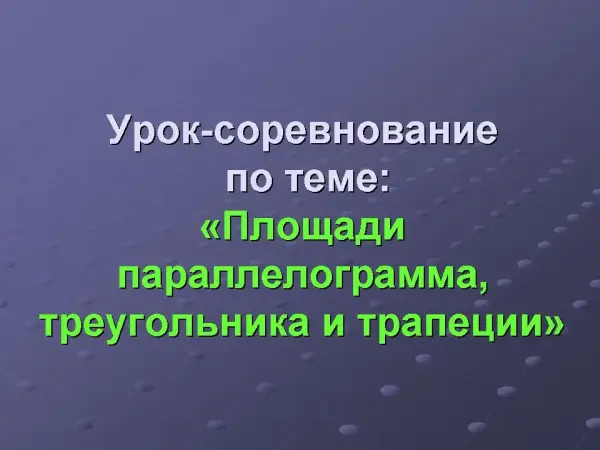 Урок служит закреплению знаний, умений и навыков учащихся применять формулы вычисления площадей параллелограмма, треугольника, трапеции при решении задач, призван закрепить практические умения учащихся при вычислении площади, развивать логическое мышление, математическую речь, вычислительные навыки учащихся, воспитывать прилежание, любознательность, интерес к геометрии, творческие способности.