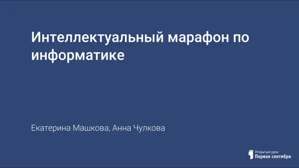 Интеллектуальный марафон проводится среди команд одной параллели или одного класса. Включает в себя задания уровня 3–6-х классов из непрерывного курса информатики по учебникам: Горячева А.В. "Информатика в играх и задачах" (3–4-й класс), Босовой Л.Л. "Информатика" (5–6-е классы). Материалы работы могут быть использованы как во внеклассной работе, так и на уроках информатики.