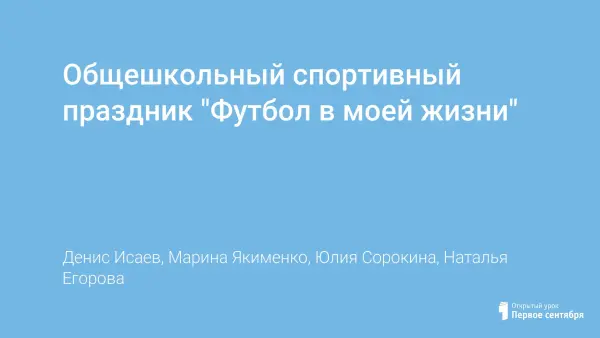 Одним из вариантов проведения Дня здоровья в школе может стать спортивно-творческий праздник "Футбол в моей жизни". В этот день классные коллективы принимают участие в различных состязаниях, таких как мини-футбол, комический футбол, конкурс стенных газет, конкурс на лучшую группу поддержки, конкурс спортивных комментаторов, конкурс на лучшего игрока "FIFA 2010" и т.п. Такой вариант проведения праздника является примерным. По аналогии могут быть организованы Дни других видов спорта в школе.