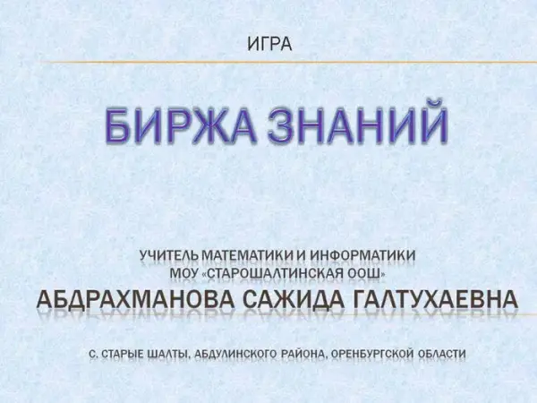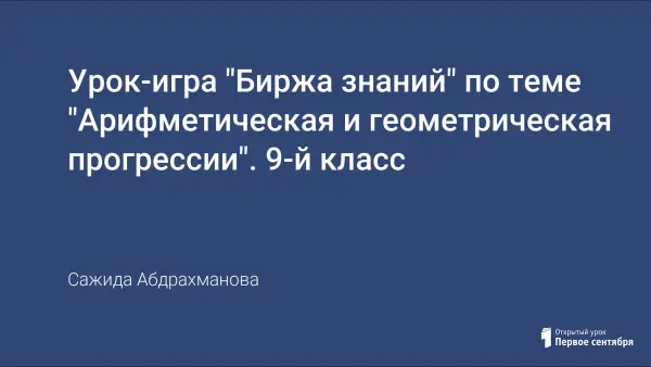 Урок-игра "Биржа знаний" предназначен для 9-го класса. Он является обобщающим в изучении раздела "Арифметическая и геометрическая прогрессии". На уроке учащиеся повторяют и закрепляют, как решать задачи по арифметической и геометрической прогрессии, вычислять проценты.