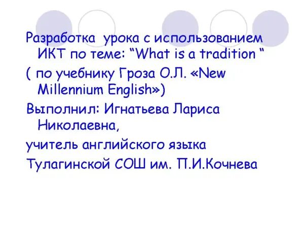 Урок разработан по технологиям, используемым в "Voice of America". Воспитывает межличностные отношения, культуру общения. Автор развивает интерес к учению и формированию познавательной активности.