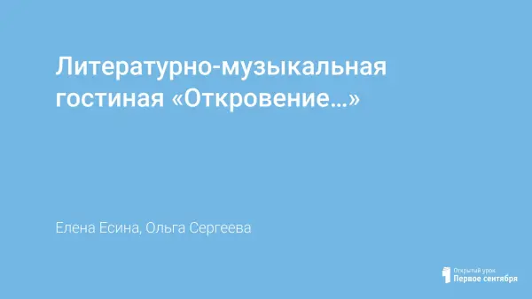 Интегрированное мероприятие «Откровение» – это разговор о людях, имя, жизнь и творчество которых связано с Тамбовским краем. Оно может проводиться для широкого круга слушателей, быть включено в цикл внеклассных уроков по духовно-нравственному воспитанию подрастающего поколения.