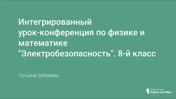 Интегрированный урок-конференция по физике и математике в 8-м классе с целью обобщения знаний. Урок проходит в необычной форме, т.к. ведут его сами ученики. Уроку предшествует подготовка в течение трех недель: ученики готовят сообщения, доклады, выполняют рисунки по электробезопасности в природе, быту и технике, пишут рассказы, сочиняют слоганы, стихи и частушки, составляют и решают математические задачи. На уроке заслушиваются отчеты групп, подводятся итоги, называются лучшие.