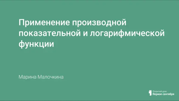 На этом уроке учащиеся имеют возможность обобщить понятие производной логарифмической и показательной функций, определить область применения: составление уравнения касательной, решение задач на нахождение экстремумов, наибольшего и наименьшего значений функции. В составлении урока использовались материалы по подготовке и тренировке к ЕГЭ, определяющие степень усвоения темы учащимися.