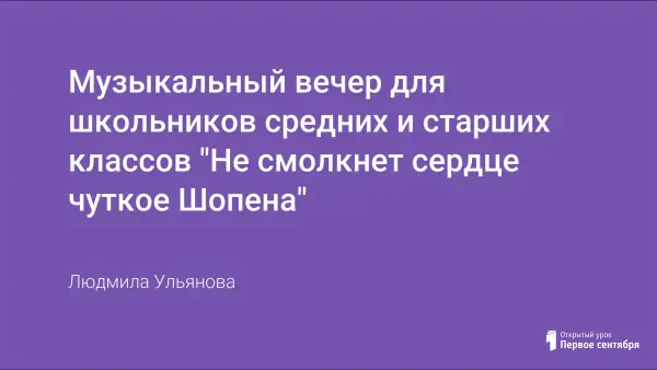 Работа представляет собой один из вариантов психологической настройки школьников на восприятие классической музыки, в частности музыки Шопена. Поэтический и информационный материал подобран таким образом, чтобы создалась особая эмоциональная атмосфера, благодаря которой дети смогут ощутить музыку Шопена "своей", близкой им и понятной.