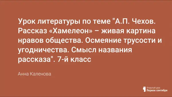 Учитель дает ученикам понятие "хамелеонства" и продолжает обучать анализу художественного текста, находить в нем художественные детали; составлять словесные характеристики персонажей на основе их поведения и речевой характеристики; проанализировать средства создания комического. У ребят развивается образное и ассоциативное мышление, навыки выразительного чтения.