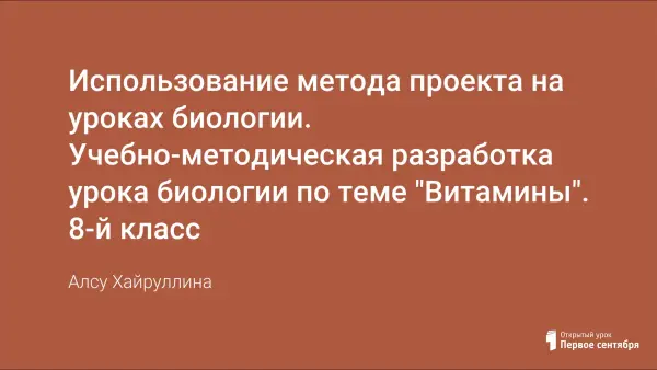В предлагаемой разработке урока биологии в 8-м классе по теме «Витамины» представлен опыт применения монопредметной проектной технологии. Данной теме отведен один урок раздела «Обмен веществ и энергии» рабочей программы курса биологии «Человек и его здоровье». Материал к уроку обширен, и дать учащимся глубокие знания о витаминах невозможно, но при использовании ИТ, разработке модели урока в режиме проектного обучения достигаются хорошие результаты.