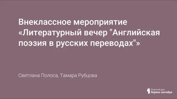 Литературный вечер, посвящен знакомству студентов с образцами английской поэзии. Все произведения английских поэтов представлены с наиболее удачными переводами на русский язык. Основные цели литературного вечера: активизация творческого и духовного потенциала студентов и более углубленное изучение произведений русской и английской литературы. В сценарии представлены биографические данные английских поэтов и особенности их творчества.