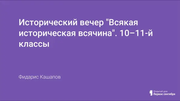 Исторический вечер для учащихся 10–11-х классов в форме телевизионной игры «Своя игра». В игре участвуют 4 команды, они отвечают на 4 блока вопросов из истории разных времен.