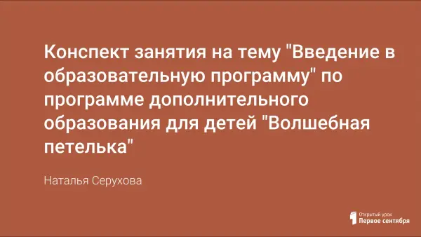 Вводное занятие знакомит детей в игровой форме с материалами, инструментами и техникой безопасности при обучении вязанию крючком по программе дополнительного образования детей "Волшебная петелька". В ходе занятия дети также выполняют куколку - оберег из пряжи. Содержание занятия обогащено пословицами, поговорками, загадками. Занятие предназначено для детей 10 лет без требований к первоначальным навыкам.