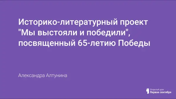Материал проекта посвящен 65-летию Победы в Великой Отечественной войне, направлен на формирование духовных и нравственных принципов. В разработке использованы материалы исторических хроник, стихотворения советских и современных поэтов, музыкальные произведения времен войны.