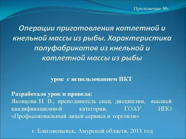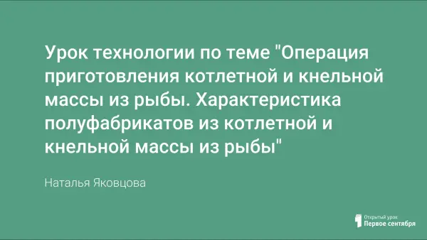 Учащиеся знакомятся с технологическим процессом приготовления котлетной и кнельной массы из рыбы и полуфабрикатов из них. Наглядно представляется сырье, которое используется для приготовления котлетной и кнельной массы из рыбы.