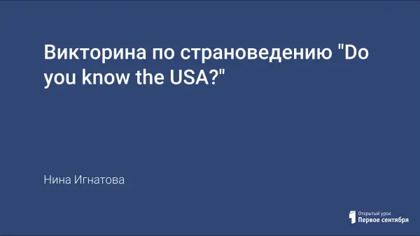 Викторина для учащихся 9-го класса, которые посещали элективный курс «Страноведение англоговорящих стран» и готовились к изучению английского языка на профильном уровне в 10-м классе. Викторину можно провести как итоговое занятие при изучении темы «США», а также на неделе иностранного языка. Правильные ответы даются в виде презентации, что повышает интерес к мероприятию. Вопросы викторины охватывают все стороны жизни жителей Америки.