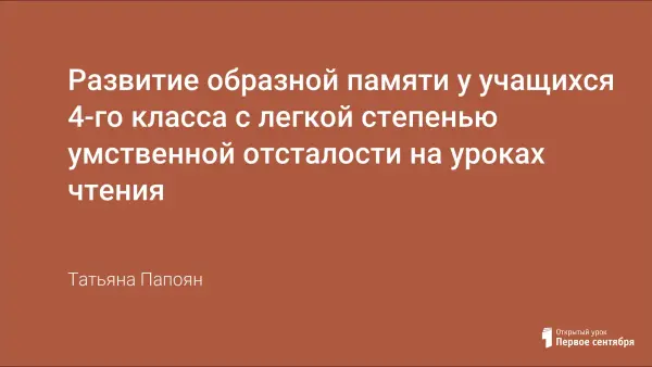 Разработана и апробирована "Рабочая тетрадь по чтению" для учащихся 4-го класса с легкой степенью умственной отсталости, включающая в себя задания и упражнения, основанные на мнемических приемах запоминания. Процессу улучшения качества образной памяти можно способствовать, создавая условия для деятельности и тренировки растущих и созревающих психических функций ребенка.