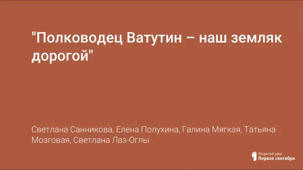 Разработка внеклассного мероприятия посвящена 110-й годовщине со дня рождения нашего прославленного земляка, полководца во время Великой Отечественной войны Николая Федоровича Ватутина. Его имя связано с развитием и укреплением наших Вооруженных сил, яркими победами на фронтах Великой Отечественной войны.
