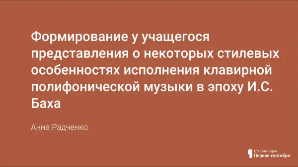 В работе содержится систематическое исследование основных аспектов прочтения и исполнения баховской клавирной музыки, необходимых в работе педагога ДМШ, передающего свои знания ученику с целью развития интереса и большей самостоятельности в работе над полифонией.