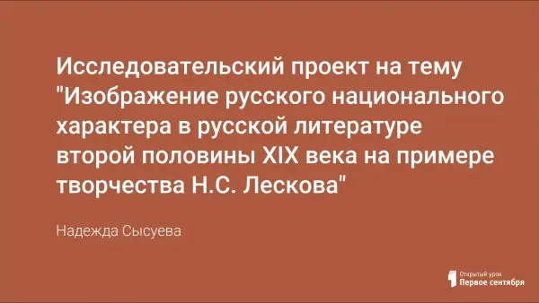 Представлен исследовательский проект. В повестях «Левша» и «Очарованный странник» писатель глубоко и всесторонне раскрыл характеры Платова и Флягина. На примере Платова писатель показал настоящий патриотизм русского человека, а на примере Флягина – этапы становления, душевного противоборства человека.