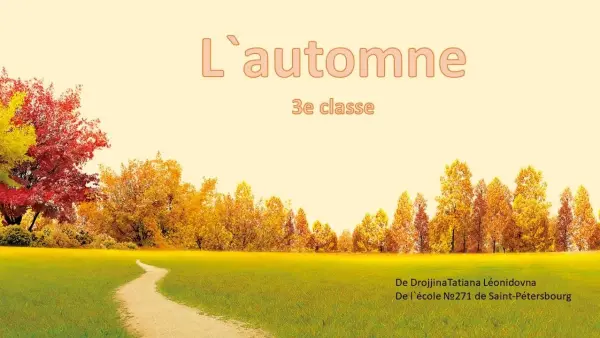 Предлагается урок с использованием презентации по теме "Осень" в помощь к учебнику 3-го класса " Le français en perspective". Презентация разработана с учётом интерактивных досок разного вида. Если это современная доска со всеми видами функций, то можно нажимать на заголовок упражнения и через ссылку переходить на само упражнение на стороннем интернет-ресурсе. Если же доска функционирует только как экран, тогда слайд позволяет использовать устную работу, потом её проверить. Большое количество картинок добавлено с несколькими целями. Яркие тёплые цвета и звук помогают сформировать положительное восприятие времени года "осень". Также картинки можно разобрать, назвав их по-французски. Задания презентации продуманы от упражнений на запоминание слов к заданиям по составлению элементарных предложений, сначала по моделям, затем самостоятельно опираясь на картинку. Далее учащиеся работают со стихотворением-загадкой. Затем идёт творческое задание на составление загадки и творческое задание в виде рисунка, который учащийся может описать и устно, и письменно. Презентацию можно использовать в рамках урока или на внеурочной деятельности.