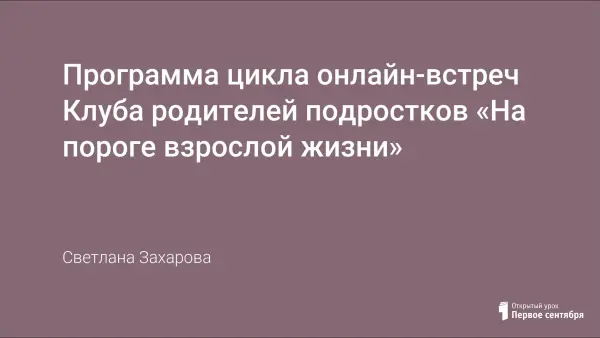 Старшеклассники и их родители часто испытывают трудности в согласовании ожиданий в процессе жизненного и профессионального самоопределения, конфликт представлений может быть очень острым. Цикл онлайн-встреч родительского Клуба (одна из которых – совместная «родители – дети») призван помочь семье наладить диалог по указанной проблеме, его цель – профилактика возможных трудностей семьи в начале периода сепарации, адаптация к новому статусу ребенка, построение новой модели взаимодействия в семье. Количество занятий по пять в каждой группе (занятия проводятся параллельно, в мини-группах), одно занятие – совместно. На базе любой интерактивной платформы. Продолжительность занятий – 30-40 минут. Периодичность встреч 1 раз в месяц.