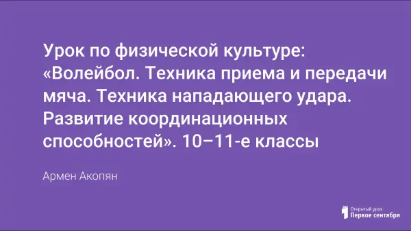 Цели и задачи урока: создать условия для формирования и развития двигательных навыков у учащихся; совершенствовать технику передачи мяча сверху двумя руками, приема мяча снизу двумя руками, верхней прямой подачи, прямого нападающего удара; закрепить изученные элементы в игре «Волейбол»; развивать физические качества: ловкость, быстроту, координацию; воспитывать умение работать в парах и в команде; воспитывать волевые качества, сознательное отношение к ценностям здоровья.