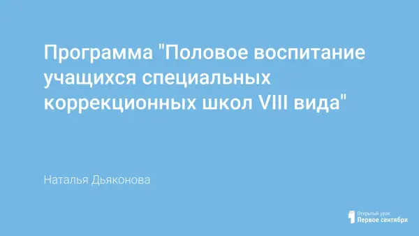 Мероприятия, предусмотренные программой, проводятся в течение процесса обучения в 4–9-х классах специальной коррекционной школы VIII вида. Программа способствует гармоничному развитию организма, привитию подростку с нарушением познавательной сферы определенных, связанных с полом гигиенических знаний и навыков, обучает владеть пробуждающимися половыми инстинктами, воспитывает сознание высокого предназначения человека.