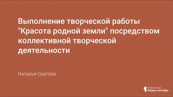 Урок помогает учащимся раскрыть красоту родной природы через восприятие реального и художественного изображения, знакомит с новым видом деятельности – коллективным творчеством. Урок рассматривается как единица учебно-воспитательного процесса, раскрывается методика организации коллективного творчества, а метод совместной деятельности раскрывается во взаимосвязи с другими методами и приемами приобщения учащихся к художественному творчеству.