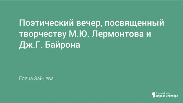 Поэтический вечер, посвященный жизни и творчеству Джорджа Гордона Байрона и Михаила Юрьевича Лермонтова. В сценарии сравнивается жизнь и творчество двух поэтов. Мероприятие проводится в рамках школьной недели иностранных языков (февраль 2011 г.) В вечере участвуют учащиеся 7–11-х классов. Сопровождается презентацией.