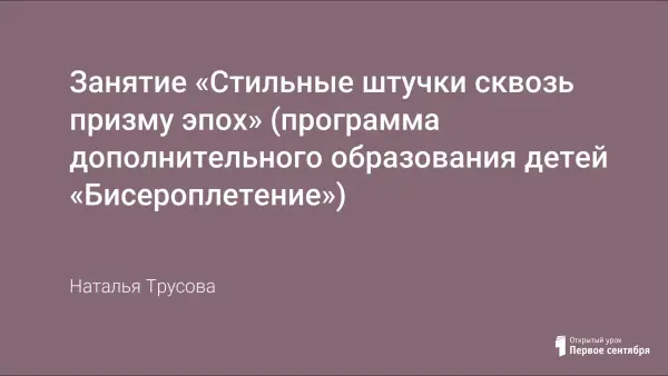 Занятие для учащихся объединения «Бисероплетение» развивает творческие способности детей в проектную деятельности. Раскрывает особенности стилей одежды, украшений трех исторических эпох. Дети выполняют творческое задание, создают стильный образ эпохи.