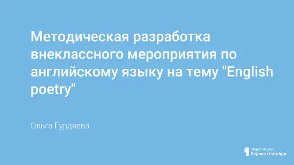Внеклассное мероприятие по английскому языку на тему «Вечер английской поэзии» представляет собой увлекательное путешествие в мир классической и современной британской литературы. Мероприятие направлено на расширение кругозора учащихся, развитие интереса к культуре англоязычных стран и углубление понимания особенностей английского языка через призму поэтического творчества. Программа вечера включает: - Чтение известных стихотворений В.Шекспира, Дж.Байрона, Р.Бернса, Р.Киплинга и других авторов на английском языке, а также переводы данных произведений С.Маршака и др. авторов. - Представления отдельных произведений учащимися. Мероприятие предназначено для обучающихся старших классов и всех желающих познакомиться ближе с богатой культурой Англии и особенностями её языка. Участие в подобном мероприятии позволит каждому обучающемуся почувствовать себя частью большой культурной традиции и обогатит внутренний мир каждого участника!