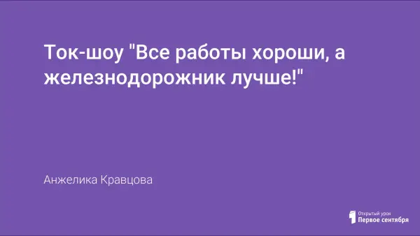 Разработка данного классного часа носит профориентационную направленность c целью дать участникам возможность показать свои знания о железнодорожных профессиях и воспитания уважительного отношения к профессиям железнодорожного транспорта. Классный час в игровой форме содержит небольшие рифмованные строки, благодаря которым нужно угадать профессию, а затем написать небольшое стихотворение о данной профессии.