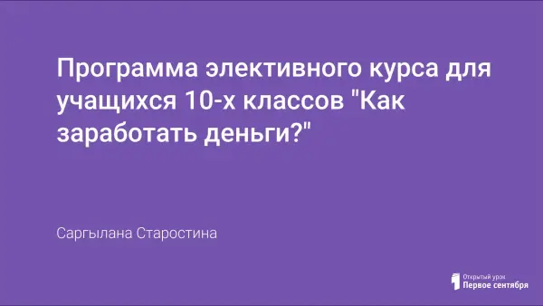 Предлагаемый курс предназначен для учащихся старших классов, чтобы помочь им приготовиться к реальному миру – миру после окончания школы. Цель курса: изучить и привить учащимся навыки обеспечения финансовой безопасности в жизни.