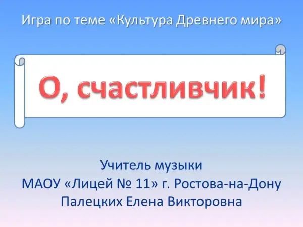 Презентация игры «О, счастливчик!» для учащихся общеобразовательных учреждений создана в формате телевизионной передачи «Кто хочет стать миллионером?». Она включает вопросы, связанные с культурой Древнего мира. В процессе игры учащиеся продемонстрируют знание античной мифологии, символики, «чудес света», произведений искусства.