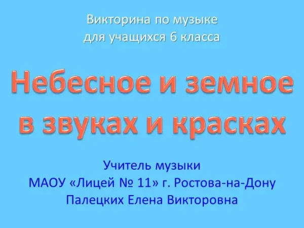 Игра предназначена для обобщения учебного материала по музыке в 7-м классе общеобразовательного учреждения. Для проведения игры создана интерактивная презентация, которая предоставляет учителю возможность выбора последовательности обобщения тем. В презентации используются межпредметные связи музыки с другими видами искусства. Музыкальный материал представлен образцами произведений русских и европейских композиторов-классиков, духовной и современной музыки разных стилей, жанров и форм.