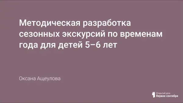 Методическая разработка сезонных экскурсий по временам года для детей 5–6 лет. «От рождения до школы» под редакцией Н.Е.Вераксы, М.А.Васильевой, Т.С.Комаровой. Раздел программы: экологическое воспитание. Цель: показать детям многоцветие окружающего мира.