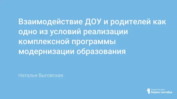 Задача модернизации взаимодействия семейного воспитания и ДОУ – развитие диалогических отношений «педагог – семья». Данные исследования выявили, что преобладание в общении педагогов с родителями происходит в монологической ориентации. От такого общения родитель мало идет на контакт с педагогом. Любая инициатива педагога, обращенная к семье, должна быть нацелена на укрепление, обогащение связей и отношений ребенка со взрослыми.