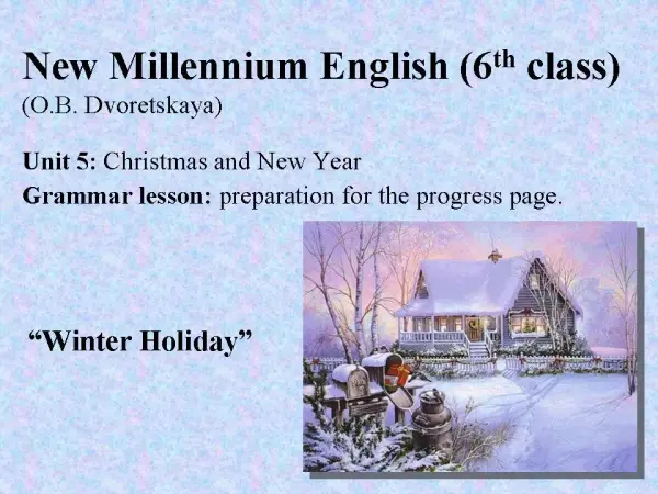 Открытый урок с презентаций по теме "Winter holidays" к учебнику "New Millennium English", 6-й класс. Урок является авторской работой, созданной для повторения грамматического материала, изученного в 5-м разделе (Unit 5) данного учебника, и подготовки учащихся к Lesson 7 Progress page и Lesson 8 Project. А также в него включена лексика всего раздела. Этот урок может быть проведён как с использованием презентации, так и с помощью раздаточного материала.