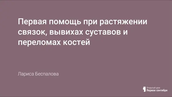 В процессе занятия описываются различные виды травм системы опоры и движения, учащиеся наобучаются различать повреждения суставов костей и растяжение связок; определять цели доврачебной помощи; оказывать первую доврачебную помощь.