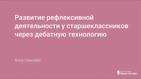 В статье рассматривается процесс развития рефлексии подростков через дебатную технологию. Показано, что результатом проведения турниров (дебатов) является процесс саморазвития и самооценки старшеклассников, способных аналитически и критически мыслить, грамотно убеждать, смотреть на любую проблему с разных точек зрения, что и составляет основу рефлексивной деятельности.