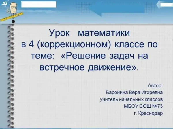 Во время урока учащиеся научатся решать и составлять задачи на встречное движение, читать схематические чертежи к задачам, выполнять письменное умножение двух чисел, соблюдать порядок выполнения действий в выражениях со скобками и без скобок, овладеют способностью понимать учебную задачу урока, отвечать на вопросы, обобщать собственные представления; слушать собеседника и вести диалог, оценивать свои достижения.