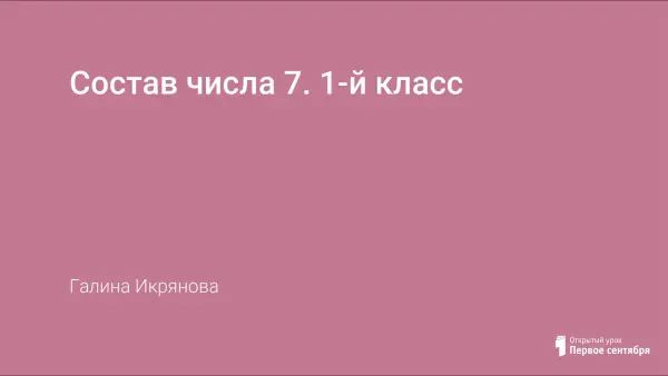 На уроке представлена система заданий, ориентированная на поэтапное усвоение числа 7. Непроизвольное запоминание состава числа формируется через классификацию предметов, выбор рисунка, соответствующего определенной записи, выбор выражения или равенства, соответствующих определенному рисунку. В результате изучения темы учащиеся приобретают умения пользоваться математической терминологией, наблюдать и делать выводы, работать самостоятельно и в паре, осуществлять самоконтроль.