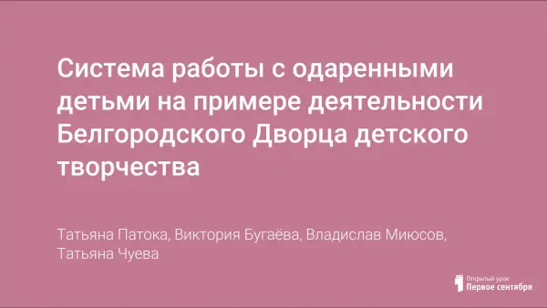 Система работы с одарёнными детьми во Дворце творчества включает в себя выявление способностей ребёнка в раннем возрасте, проведение конкурсов по различным видам творческой деятельности, позволяющих выявить талантливых детей в масштабах города, создание условий для оптимального развития способных детей, систему стимулирования учащихся. Доказательством успешной работы служат высокие результаты, которые демонстрируют ребята, участвуя в конкурсах, выставках, соревнованиях.