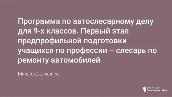 Целью предпрофильного обучения по автоделу является изучение учащимися устройства автомобилей, техники и технологии слесарных работ по техническому обслуживанию и текущему ремонту автомобилей, а также освоение ими умений и навыков работы со слесарномонтажным инструментом. В процессе труда при выполнении отдельных технологических операций учащиеся знакомятся с характером трудовой деятельности рабочих массовых профессий – слесаря по ремонту автомобилей.