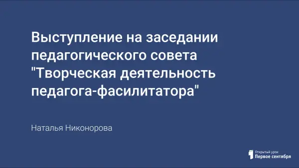 Учитель-фасилитатор – это образ мудрого, духовного, доброго и здорового человека, стремящегося к самосовершенствованию и творчеству. Другими словами: это личностный и профессиональный идеал. Древний мудрец сказал: «Не за мудрым словом идут к Учителю, а для того, чтобы соприкоснуться с его духовным миром».