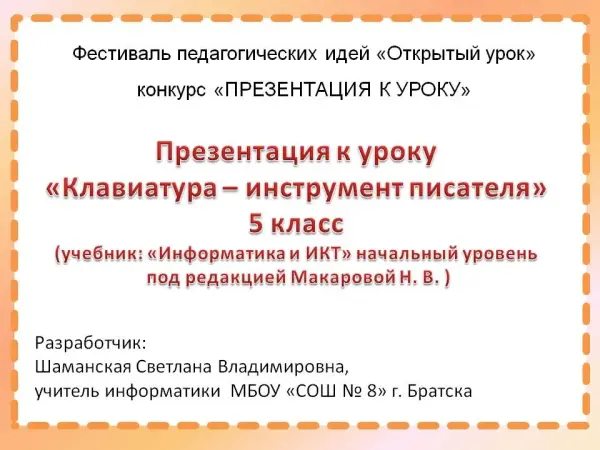 Урок по программе Н.В. Макаровой. В ходе актуализации знаний учащиеся сталкиваются с ситуацией, которая подводит их к самостоятельному формулированию темы. Содержание урока дает большее представление о клавиатуре, чем предполагается автором учебника. Практическая работ выполняется дифференцированно: учащиеся самостоятельно выбирают уровень сложности задания.