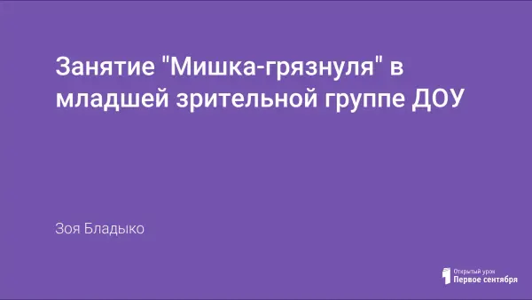 Комплексное познавательно-речевое занятие с элементами основ безопасности «Мишка-грязнуля» в первой младшей зрительной группе. Цель: закрепить ранее полученные знания по ЗОЖ; показать детям важность гигиены полости рта для здоровья человека; вызвать у детей желание следить за собой, за чистотой тела; формировать представления детей о здоровой пище; совершенствовать ориентацию в пространстве при тренировке зрительных функций, в форме, величине предметов; развивать общую и мелкую моторику; воспитывать у детей положительное отношение к чистоте.